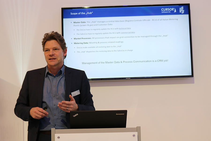 So werden alle heutigen und zukünftigen Geschäftsfelder in einem CRM-System abgebildet. Frank Peper, Geschäftsführer der ifs italia, stellte diesen Gedanken beim italienischen Abend auf dem CURSOR-Stand in seinem Fachvortrag vor: „Die komplexen Anforderungen der Energiewirtschaft dürfen die Kunden nicht berühren. Es geht darum, die Kunden einfach und schnell zufrieden zu stellen, während die Software die Hintergrundprozesse steuert.“