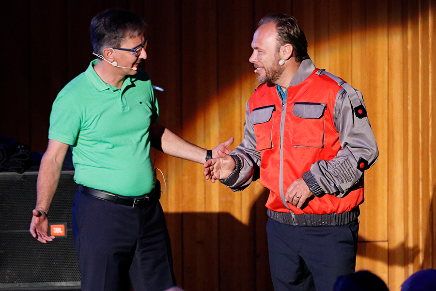 CURSOR hatte angekündigt, mit einem Vorstands-Vortrag von Thomas Rühl und Jürgen Topp zu starten – doch dazu kam es nur teilweise. Die Besucher erlebten stattdessen eine Zeitreise à la „Zurück in die Zukunft“, gestaltet durch Vertriebsleiter Andreas Lange und die beiden Vorstandsmitglieder Stefan-Markus Eschner und Jürgen Heidak. In den Vortrag wurde neben Rückblicken auf die Anfänge in den Jahren 1987 sowie 1997 und 2007 auch Gratulationen an die langjährigen CURSOR-Kunden ABICOR-Binzel für 30 Jahre Zusammenarbeit und Landesbank Hessen-Thüringen für 20 Jahre Zusammenarbeit einbezogen. Die gelungene Mischung aus Zeitreise-Elementen und Neuheiten der CRM-Lösungen wie die Sprachsteuerung begeisterte die Besucher.