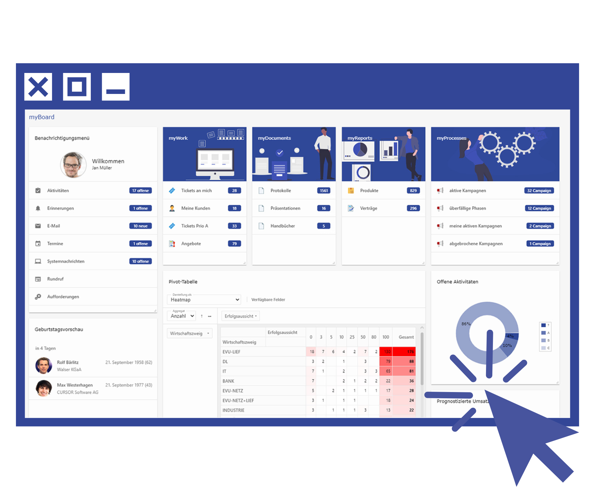 CURSOR-CRM unterstützt Ihr Vertriebsteam durch zentrale Informationen, visuelle Auswertungen und automatisierte Prozesse. So sind Angebote und Verträge mit wenigen Klicks erstellt. Dabei bindet CURSOR-CRM automatisch alle relevanten Daten ein, auch aus Drittsystemen. Wertvolles Wissen zum Kundenverhalten liefert Ihnen das Analytics-Modul, sodass Sie Ihre Angebote gezielt platzieren können.