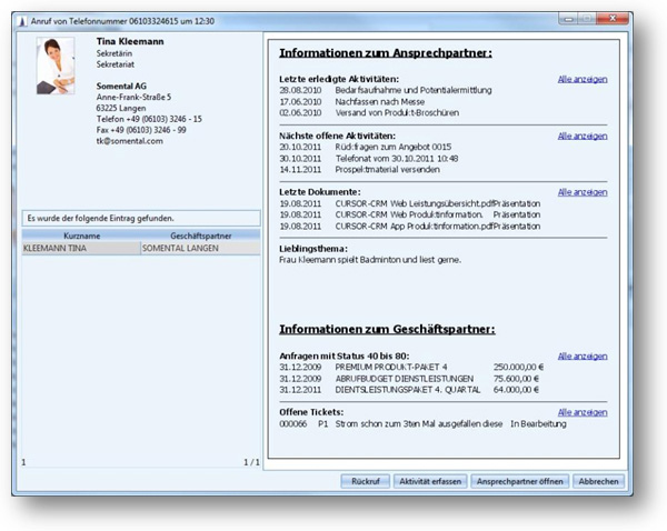 Ob im Kundenservice, im Call-Center oder im Reklamations- und Beschwerdemanagement: die Einsatzbereiche sind vielfältig. Art und Umfang der Informationen in dem Dialogfenster sind individuell durch den Systemadministrator konfigurierbar. Ausführliche Informationen zu diesem und weiteren Produkt-Highlights in CURSOR-CRM erhalten Sie übrigens am schnellsten bei einer Online-Präsentation.