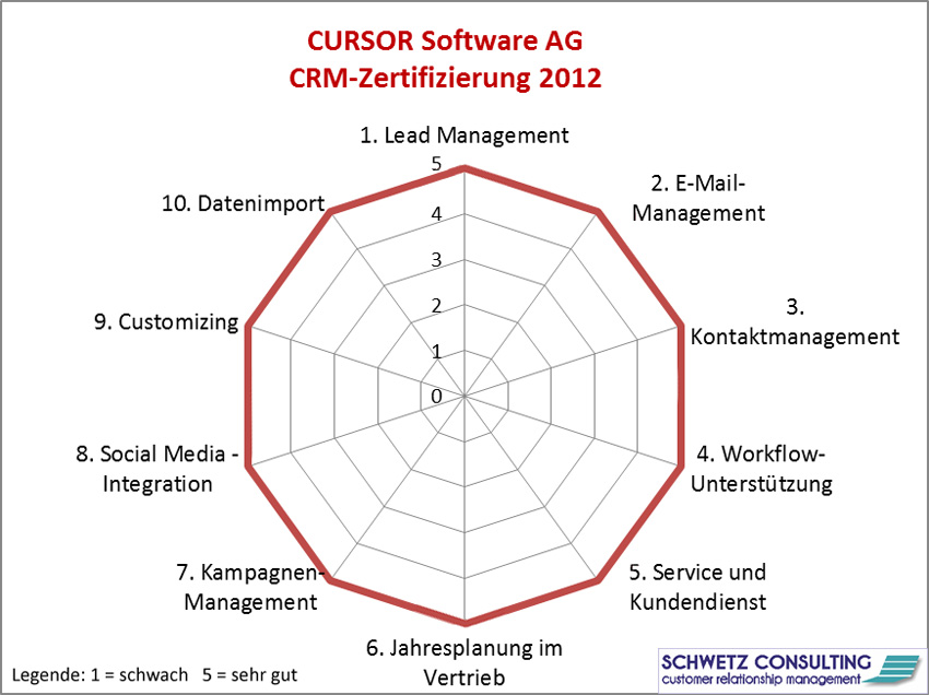 Besser geht es nicht: "CURSOR ist es gelungen, die 10 Aufgaben aus der täglichen Praxis in Marketing, Vertrieb und Service überzeugend zu lösen und hat damit in der Gesamtbewertung hervorragend abgeschnitten", fasst Wolfgang Schwetz die im Oktober 2012 durchgeführte Zertifizierung zusammen. Schwetz, einer der führenden CRM-Experten im deutschsprachigen Markt, zeigte sich beeindruckt von der Qualität und der vorbildlichen Praxistauglichkeit von CURSOR-CRM.