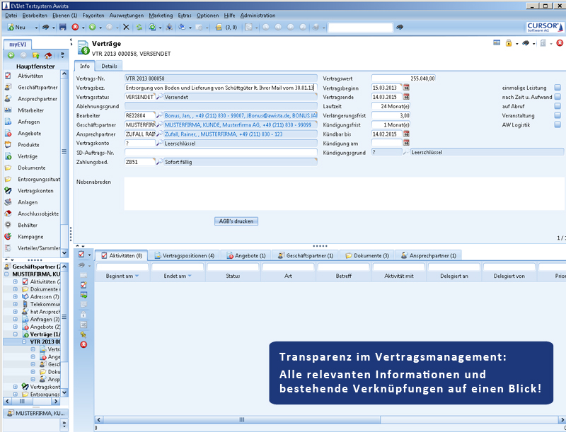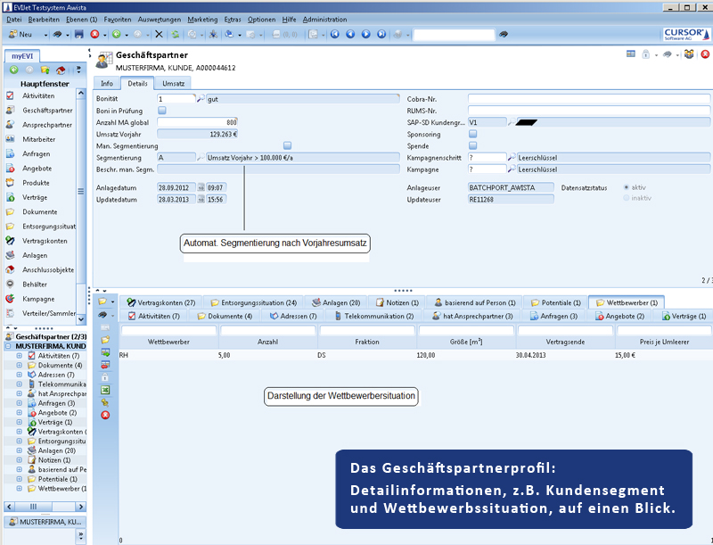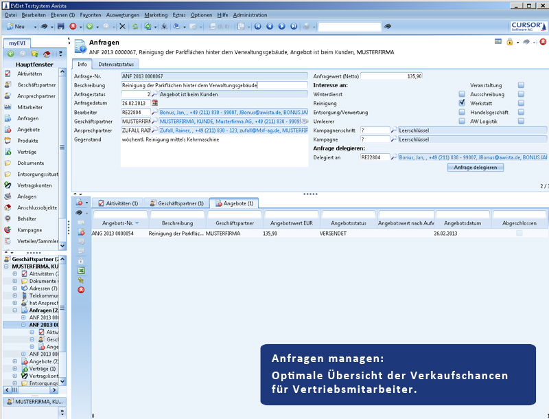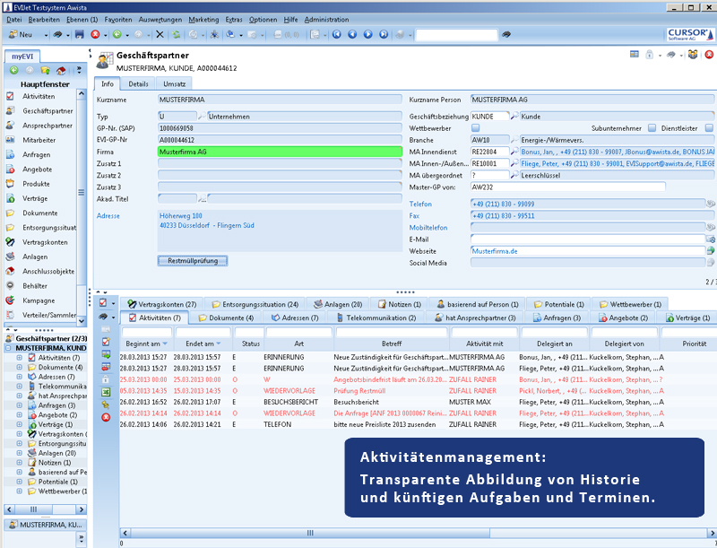 Bei der Auswahl der CRM-Software standen zwei Anbieter in der Endausscheidung, darunter die CURSOR Software AG, die mit ihrer CRM-Lösung EVI schließlich das Rennen machte. Ausschlaggebend dafür waren mehrere Aspekte. Zum einen arbeitet die Stadtwerke Düsseldorf AG, mit 51 % Mehrheitsgesellschafter der AWISTA GmbH, schon seit 1998 mit dieser Anwendung. Noch entscheidender fiel ins Gewicht, dass bei den Stadtwerken bereits eine Schnittstelle zwischen dem CRM-Werkzeug und SAP IS-U bestand, der SAP-Branchenlösung für Energieversorger. Und SAP Waste & Recycling basiert auf dem Datenmodell von SAP IS-U. „Für uns war dieser Schnittstellenaspekt besonders wichtig, da wir etwa Umsatzinformation aus SAP in Form eines Reports direkt in das CRM-System einlesen wollten, um auch über diese Information im Vertrieb unmittelbar verfügen zu können“, erläutert Norbert Pickl. „Bei der anderen CRM-Lösung wären wir Pilotkunde geworden. Das hätte uns zu viel zusätzlichen Projektaufwand beschert.“