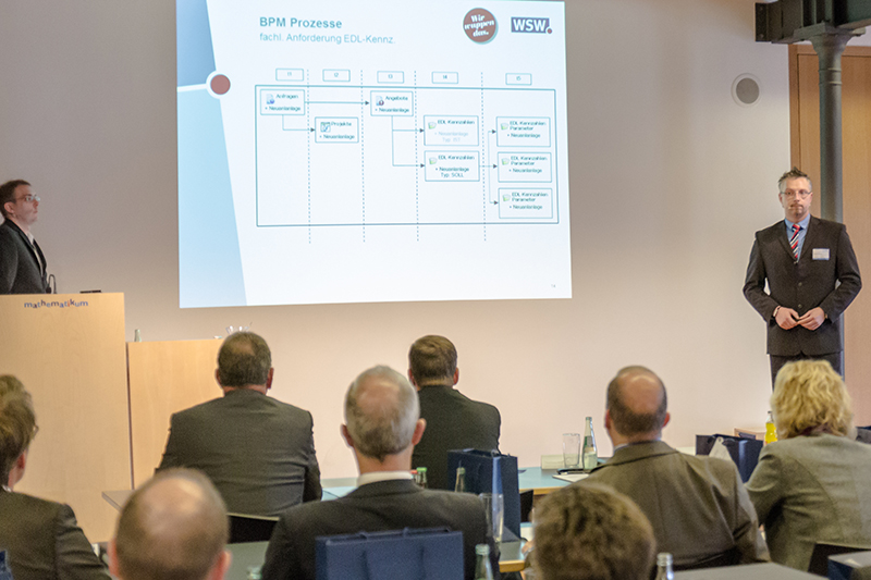 Welchen Nutzen das BPM-Tool in der Praxis bietet, zeigten Thomas Wahle, IT-Koordination CRM, und sein Kollege und IT-Spezialist Thomas Kapitza von den Wuppertaler Stadtwerken. Sie haben CURSOR-BPM als Referenzkunde bereits für die Gestaltung mehrerer Geschäftsprozesse eingesetzt. Und das mit großem Erfolg: Sie berichten u.a., dass Angebote für RLM-Kunden nun innerhalb von nur 20 Minuten erstellt werden können. Aus dem Auditorium berichtete Andreas Zinn von der ovag Energie AG über eine Effizienzsteigerung von „deutlich mehr als 50%“ bei der internetbasierten Zählerstandserfassung durch einen Workflow, der mit Hilfe von BPM aufgesetzt worden war.