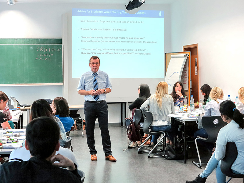 Thomas Rühl, heute Vorstandsvorsitzender der CURSOR Software AG, berichtete über die Anfänge seines Unternehmens und wie es ihm mit viel Einsatz und Elan gelang, CURSOR vom Ein-Mann-Unternehmen im heimischen Esszimmer zu einem der führenden CRM Software- und Beratungshäuser mit mehr als 75 Mitarbeitern zu entwickeln. Die Studierenden nutzten die Gelegenheit zum intensiven Dialog mit dem erfolgreichen „Entrepreneur“: Die Fragen reichten von der Finanzierung des Unternehmens über die ersten Werbemaßnahmen bis hin zum Finden und Managen von Mitarbeitern.