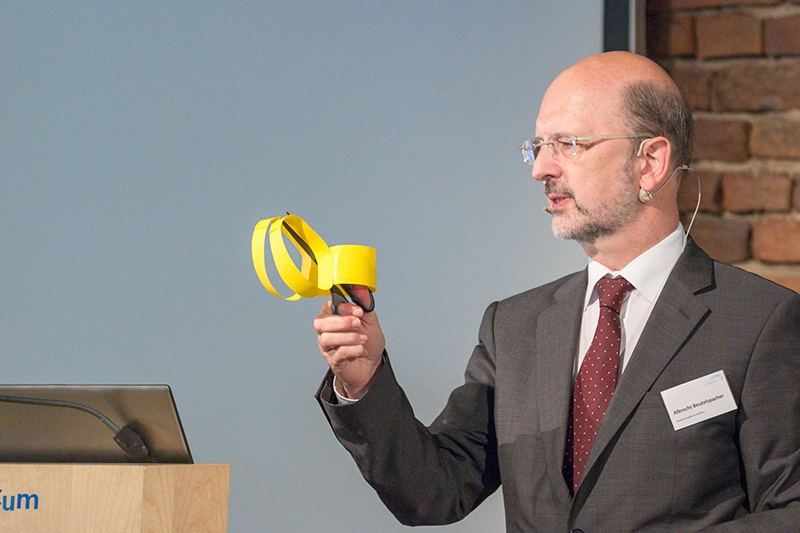 Prof. Dr. Albrecht Beutelspacher, Initiator und Gründer des Gießener Mathematikums, präsentierte den Teilnehmern in einem kurzen Beitrag Idee und Geschichte seines „Mitmach-Museums“. Dass Mathematik alles andere als langweilig ist, zeigte er live mit einem Experiment. Aus zwei Papierstreifen entstanden mit Hilfe einer Schere und etwas Klebstoff zu-nächst zwei Kreise und dann ein Quadrat – die Quadratur der Kreise sozusagen.