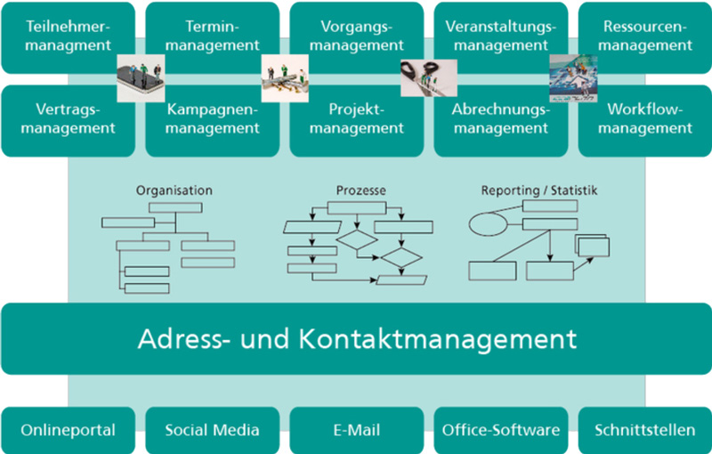 Alle Module des CRM-Systems sollen darauf abzielen, die Beziehungen zum Kunden zu verbessern; der Kundenservice ist ein essentieller Faktor. Um alle Informationen zu jedem einzelnen Kunden perfekt abbilden zu können und einen detaillierten Überblick über jede Person oder Firma zu erlangen, ist das Adressmanagement zentraler Dreh- und Angelpunkt des Systems. Die Qualifikationen der 5.000 zertifizierten Trainer (auch in Form von Verträgen) werden hier verwaltet. Es handelt sich um ein zentrales Kommunikationsmanagement auf Basis des Personen-Rollen-Modells. Darauf aufbauend sind die Bereiche Verkaufsmanagement-, Veranstaltungsmanagement und Reklamationsmanagement angebunden. Weitere Bereiche, die durch ECOPLAN CRM abgebildet werden, sind das Vertragswesen und das Kampagnenmanagement.