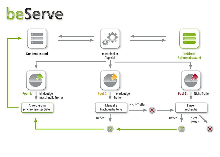 beDirect bietet ausgereifte Produkte und individuelle Lösungen in den Bereichen Data Quality, Sales Solutions, Cleanup Systems und Address Services. Das Unternehmen wurde 2001 als Joint Venture von arvato, dem Outsourcing-Spezialist aus dem Hause Bertelsmann, und Creditreform, der größten Wirtschaftsauskunftei Deutschlands, gegründet. In den letzten Jahren hat sich beDirect zum führenden Lösungspartner im Business-to-Business-Segment entwickelt. 100 Mitarbeiter an fünf Standorten in Deutschland bieten den Kunden aus Telekommunikation, Handel, Finanzdienstleistungen, Behörden und anderen Branchen Adressen, Daten und Individuallösungen für die Kundengewinnung und die Bestandskundenpflege. Die Datenbank von beDirect ist in Umfang, Informationstiefe und Aktualität einmalig in Deutschland. Sie enthält über drei Millionen bonitätsgeprüfte und wirtschaftsaktive deutsche Firmenadressen plus Zusatzinformationen; insgesamt über 14 Millionen B2B- und consumerähnliche Daten.