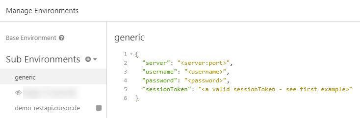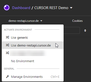 Sollten Sie ebenfalls den Insomnia REST Client nutzen, können Sie das Projektfile unter https://www.cursor.de/demo/restapi/insomnia.json herunterladen. Die Anmelde- und Serverdaten können einmalig im Environment Image 2 verwaltet werden. Die Beispielaufrufe verwenden dann die dort hinterlegten Daten.